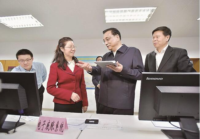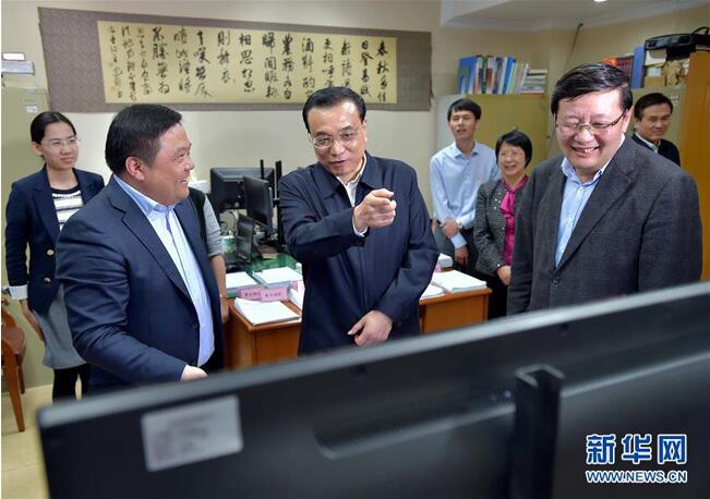 4月1日,中共中央政治局常委、国务院总理李克强就全面实施营改增到国家税务总局、财政部考察并主持召开座谈会。这是李克强在国家税务总局信息系统监控室,向工作人员详细了解营改增开票、申报过程,以及税收征管信息系统运转和技术保障情况。新华社记者 李涛 摄