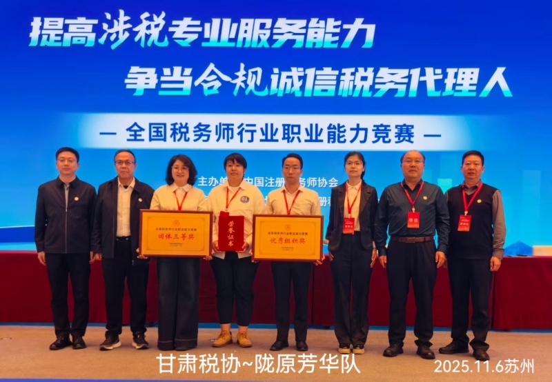 秋阳煦暖,太湖潋滟。在刚刚落幕的全国税务师行业职业能力竞赛团体赛的激烈角逐中,代表甘肃省注册税务师协会出征的“陇原芳华队”凭借精湛的专业素养与默契的团队协作,一路披荆斩棘,从全国37支顶尖队伍中脱颖而出,最终勇夺团体赛全国三等奖,并荣膺团体总排名第八的骄人战绩!与此同时,甘肃省税协因在赛事组织、团队保障工作中的卓越表现和突出贡献,被授予“优秀组织奖”,与参赛团队共同闪耀于这全国性的行业荣誉殿堂。